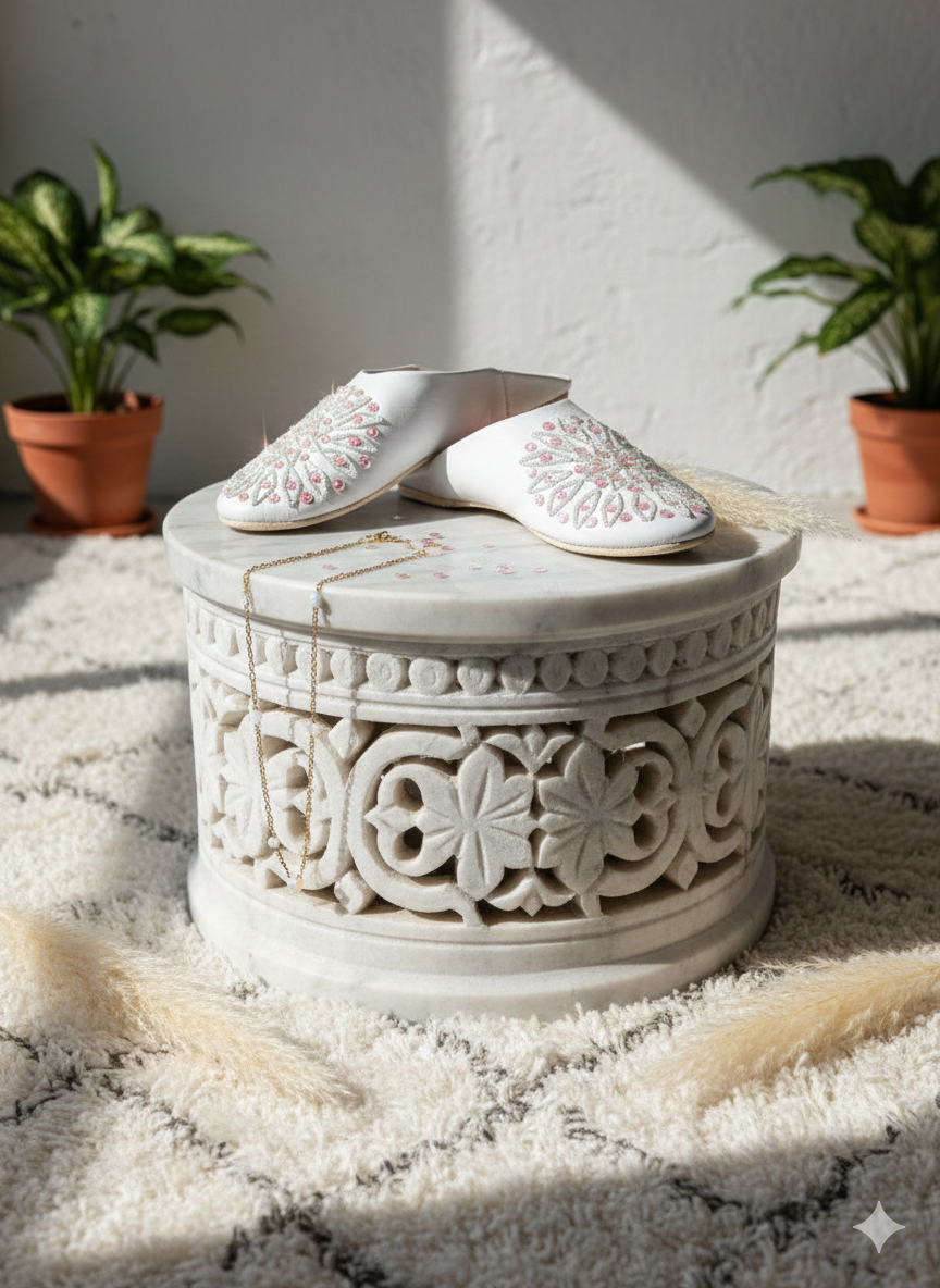100% Fait Main : Chaque babouche Marrakech est coupée, cousue et grave manuellement. Vous ne trouverez jamais deux paires exactement identiques.