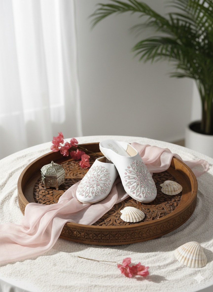 Pour créer les babouche que vous voyez ici, j’ai sélectionné un cuir de chèvre de premier choix, souple et résistant. Ce modèle pour femmes se distingue par ses motifs géométriques brodés avec une précision incroyable, offrant un look à la fois bohème et luxueux.